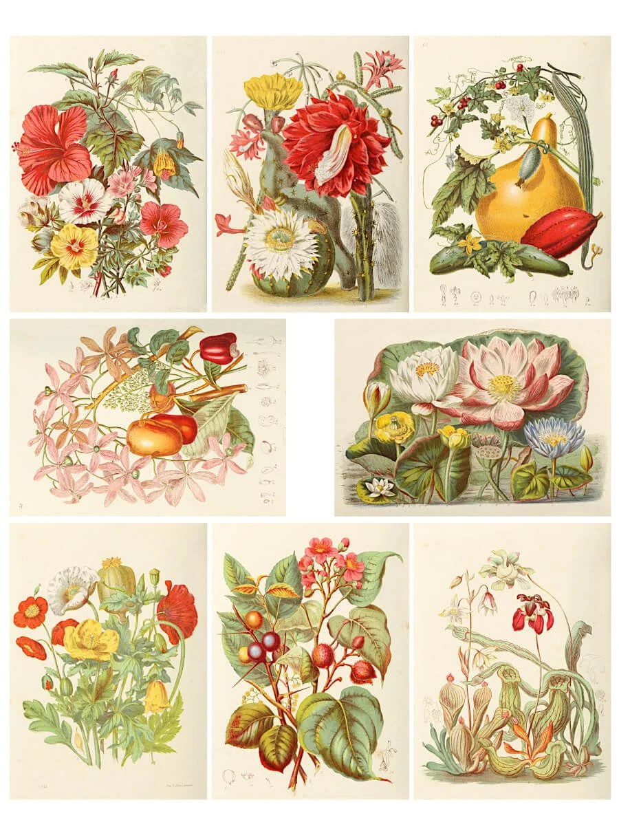 Each image on this sheet measures approximately 2.5 x 3.5 inches, the perfect size for Artist Trading Cards (ATCs), journal pockets, or small collage compositions. The sheet includes an assortment of floral studies, from bright hibiscus blooms to water lilies, poppies, and flowering vines, each taken from an antique botanical book.The ATC format makes these prints ideal for layering on journal pages, creating tags, or using as mini art cards. Because each illustration was originally drawn with remarkable botanical accuracy, the details hold up beautifully even when printed small.