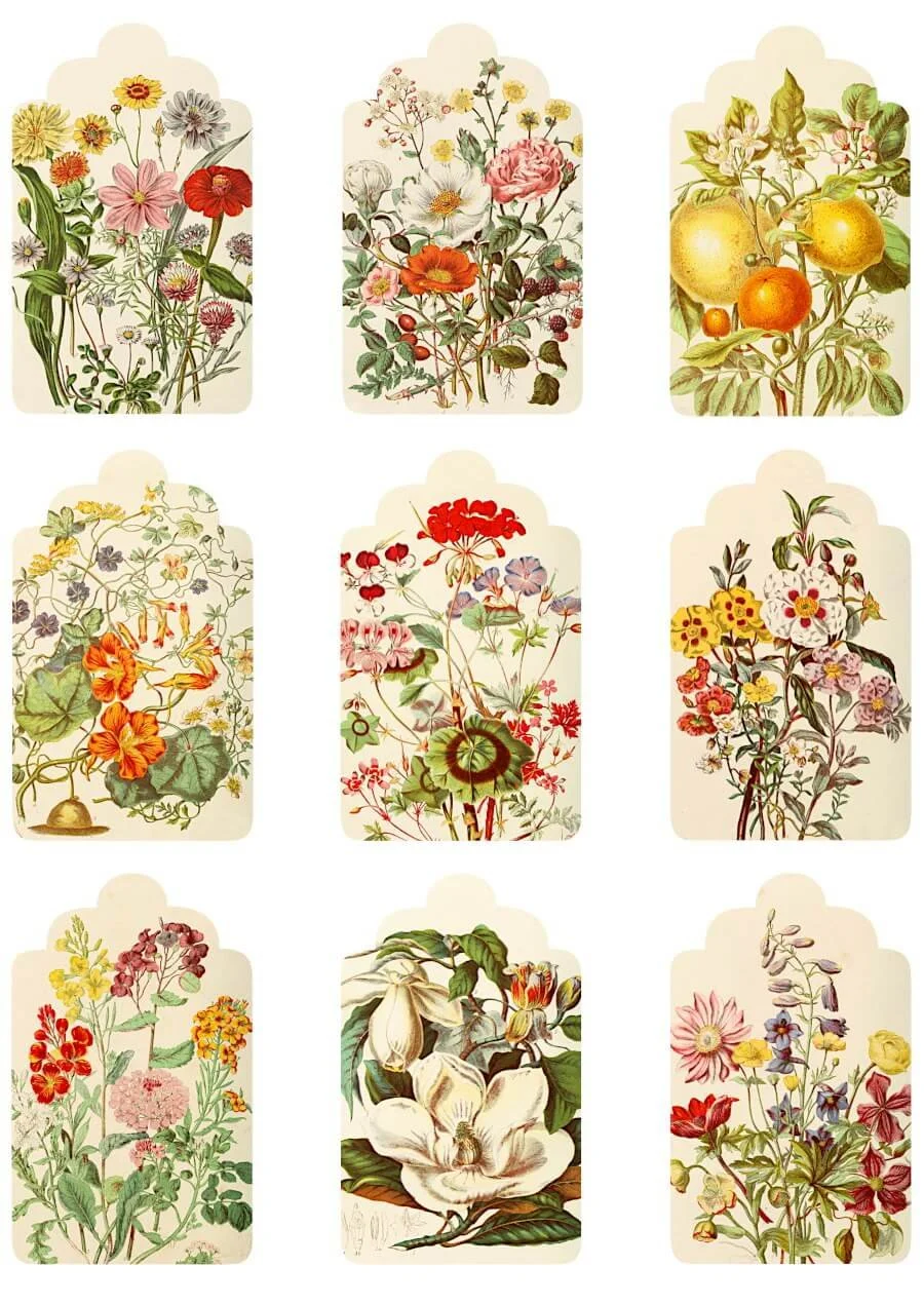 The second sheet transforms these flowers into vintage-style gift tags, complete with soft-edged tops and rounded corners. Each tag features a different floral bouquet or plant study, perfect for gift wrapping, handmade packaging, or labeling your own craft supplies.You can print them on heavy cardstock, punch a small hole, and tie them with twine or ribbon for an instantly elegant touch. They also make lovely tags for handmade goods if you sell at craft fairs or markets.