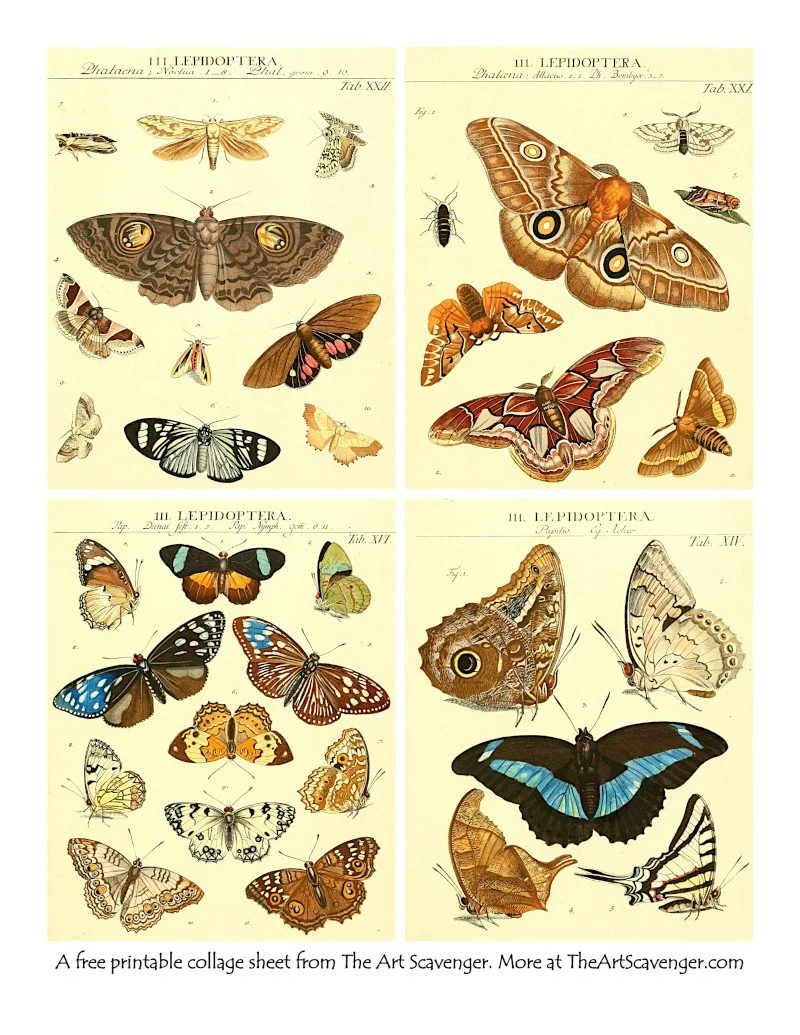 Includes two printable collage sheets of vintage butterfly and moth illustrations from 1789