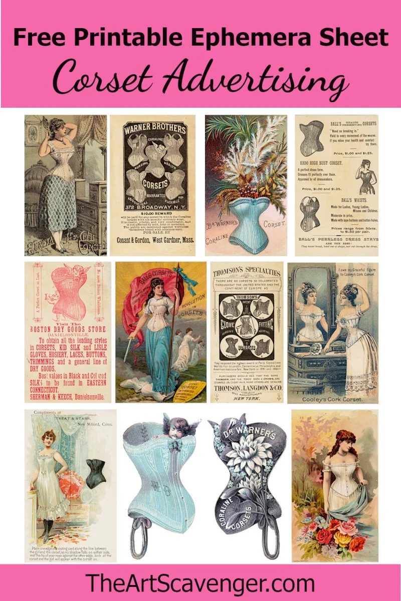 This free printable ephemera sheet features a collection of vintage corset ads. I suppose corsets were the original shapewear since they were meant to train the body into a curvy shape by reducing the waist, thereby making the bust and hips appear larger.