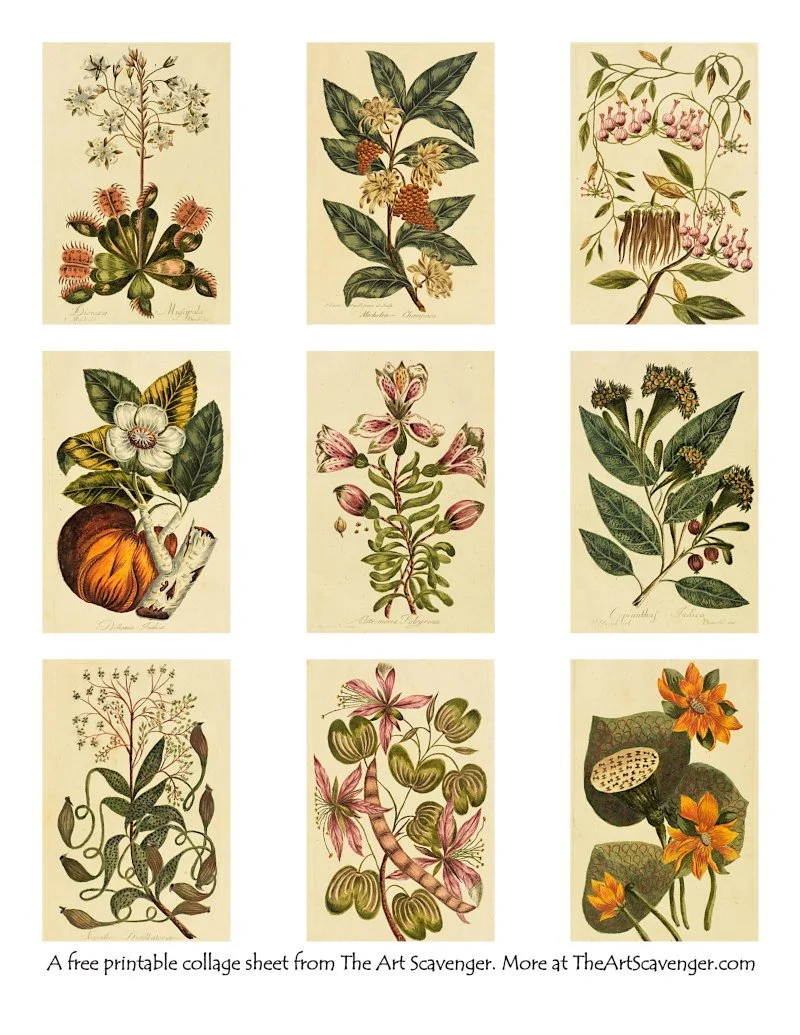 The vintage flower illustrations on these free collage sheets came from an Italian book published in 1786. I absolutely love the translation that Google gave for the title - Decade of Curious Trees and Elegant Plants of the East Indies. I know that by curious they meant that the trees were strange or unusual, but I love to anthropomorphize, so I imagine the trees quietly observing the humans. Likewise, the description “elegant plants” conjures images of plants in little black dresses and strings of pearls. All kidding aside, I really like the warm colors in these illustrations.