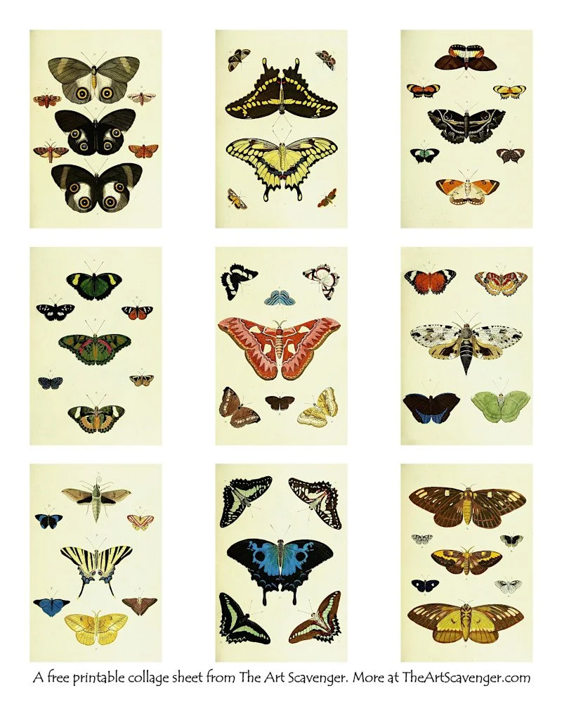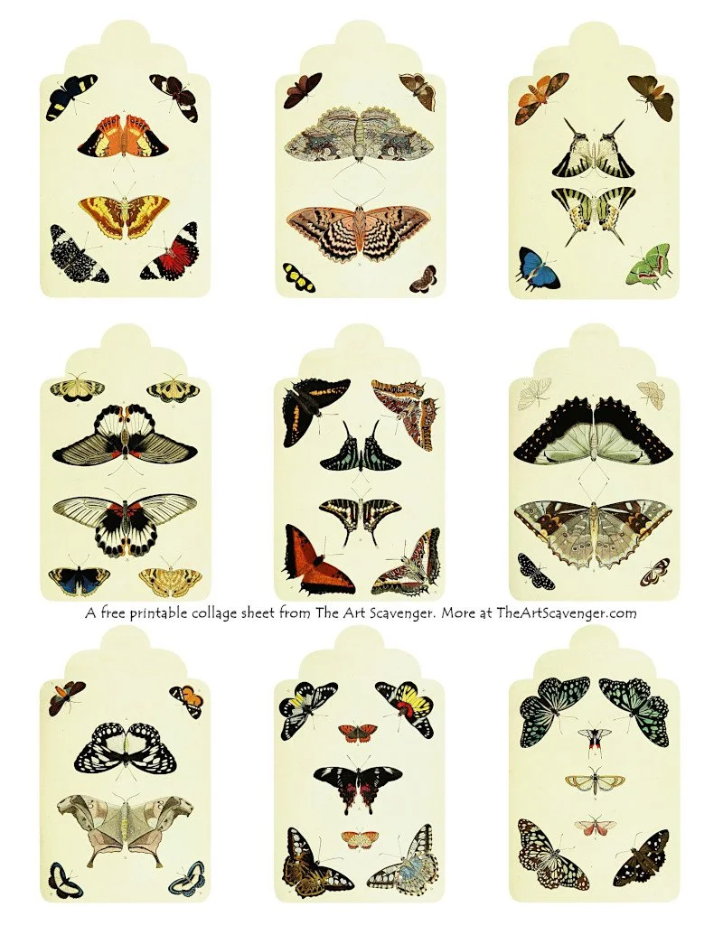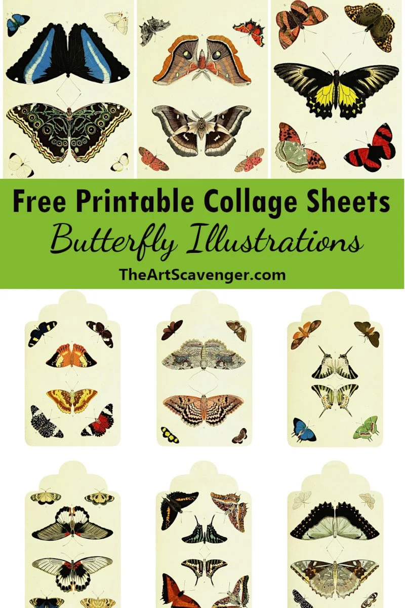 Butterflies and moths are the main attraction on these free printable collage sheets. I almost neglected to include ‘moths’ in the title, and in fact, I left it out in the graphic above. The title page of the book they came from was in both Dutch and French. I was able to pick out “Papillons Exotiques,” or “Exotic Butterflies.” I was ready to run with that title until I examined the bugs and realized that there were also moths. The feathery antennae on some are what tipped me off. The moths that frequent my yard, and occasionally my house, are generally just tan in color. I often forget how beautiful moths can be.