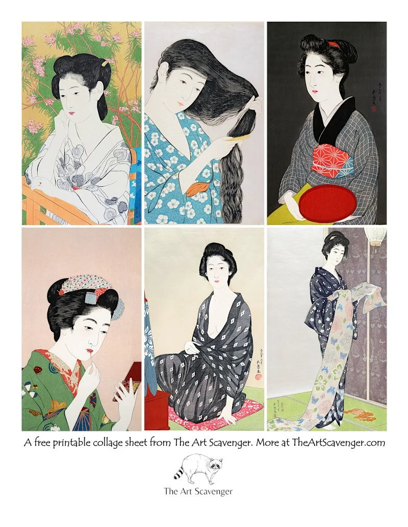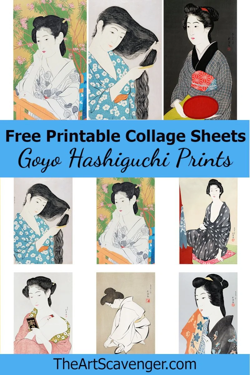 The woodblock prints that are featured on these free printable collage sheets were designed by the Japanese artist, Goyo Hashiguchi (born Kiyoshi Hashiguchi). He lived from 1880 to 1921. Goyo was an oil painter early in his career but later turned to woodblock printmaking. He had extremely high standards, and as a result, only completed 14 prints during his lifetime.